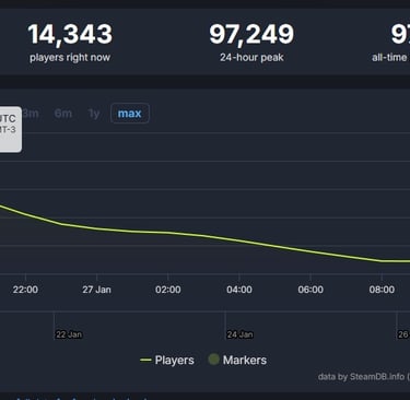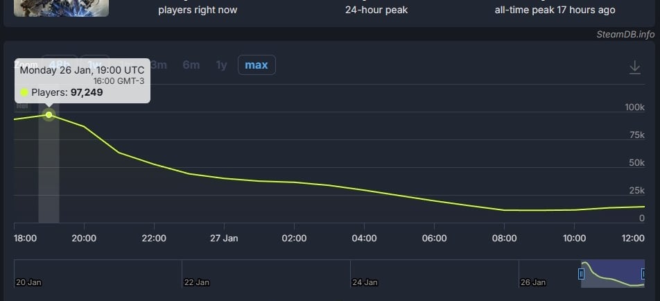 No entanto, o fôlego inicial não se sustentou. Ainda de acordo com o SteamDB, a base de jogadores ativos caiu de forma acentuada ao longo do dia, chegando a cerca de 14 mil jogadores simultâneos no momento da publicação — uma queda significativa que reforça o impacto das avaliações negativas.
