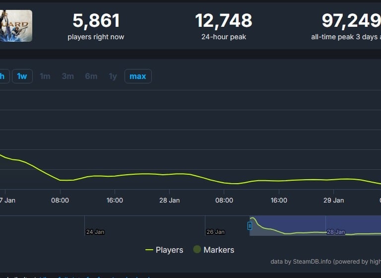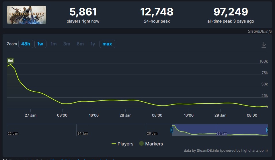 De acordo com dados do SteamDB, Highguard registrou, nas últimas 24 horas, um pico de aproximadamente 12 mil jogadores simultâneos. O número contrasta fortemente com a estreia do jogo, quando o shooter ultrapassou a marca de 97 mil jogadores, representando uma queda de cerca de 90% da base ativa.