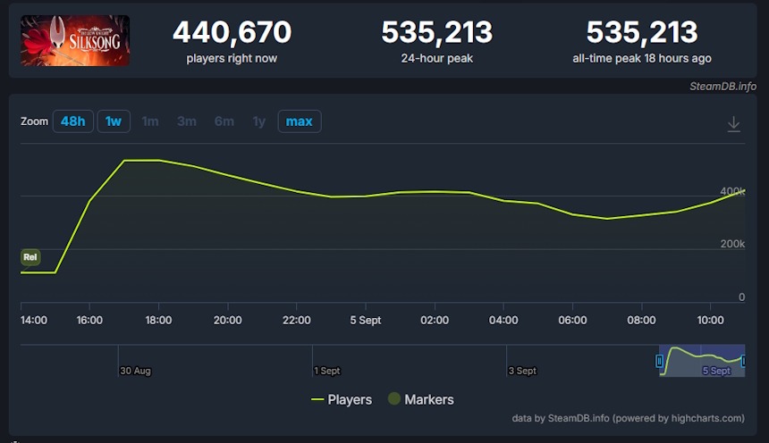 Hollow Knight Silksong alcançou mais de 535 mil jogadores simultâneos na Steam em 24h, tornando-se um dos maiores lançamentos da história da plataforma.